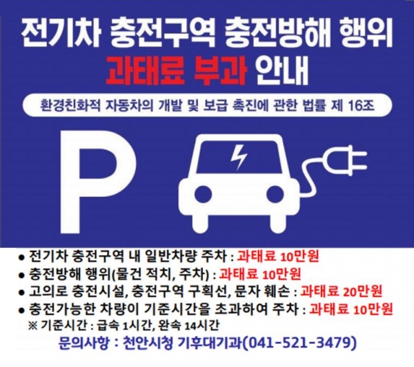 [세종타임즈] 천안시가 전기자동차 충전구역 내 위반행위에 대한 과태료 부과 건수가 증가하면서 주의를 당부했다.