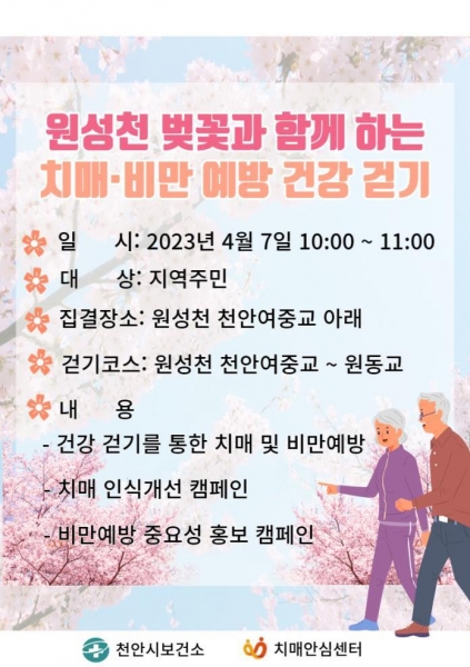 [세종타임즈] 천안시보건소는 오는 7일 원성천에서 ‘벚꽃과 함께하는 치매·비만 예방 건강 걷기’ 캠페인을 진행할 예정이다.