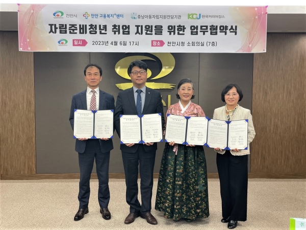 [세종타임즈] 천안시는 6일 시청 소회의실에서 자립준비청년의 취업 지원을 위해 충남아동자립지원전담기관, 천안고용복지플러스센터, ㈜한국커리어잡스와 4자 간 업무협약을 체결했다고 밝혔다.