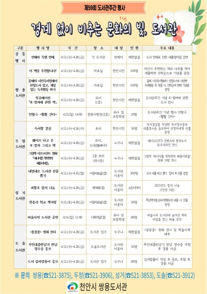 [세종타임즈] 천안시 쌍용도서관이 제59회 도서관 주간을 맞아 쌍용·두정·성거·도솔도서관에서 오는 12일부터 28일까지 다양한 행사를 운영한다고 밝혔다.
