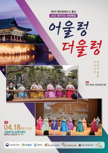[세종타임즈] 홍성군 문화특화사업단의‘2023년 찾아가는 문화배달’지원사업에 선정된 사단법인 소리너울 예술단의‘어울렁 더울렁’공연이 4월 18일 화요일 오후 1시 30분 소망재가노인복지센터에서 개최된다.
