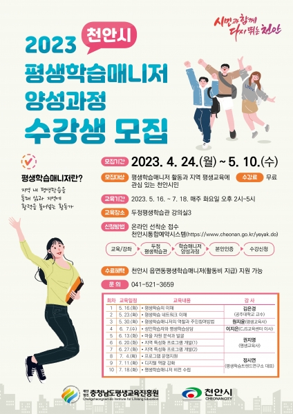 지역 내 평생교육 인적자원 전문성을 강화하고자 진행되는 이번 평생학습매니저 양성과정 교육은 5월 16일부터 7월 18일까지 매주 화요일 오후 2시 천안시두정평생학습관에서 진행될 예정이다.