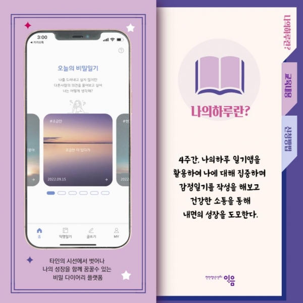 올해는 천안 청년 창업자가 개발한 비밀 일기 앱인 ‘나의 하루’를 활용해 교육을 진행할 예정이다.
