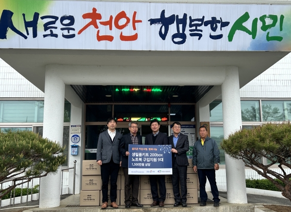 이날 골프존카운티와 골프존문화재단은 라면, 즉석밥 등 식품으로 구성된 1,000만원 상당의 생필품키트 200개와 저소득가정 고등학생 자녀의 학습용 전자기기 구입 비용으로 현금 500만원을 병천면에 기탁했다.