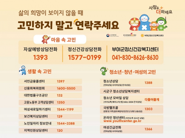 [세종타임즈] 부여군은 봄철 자살률이 증가하는 경향에 따라 3~5월을 자살예방 집중관리 기간으로 정하고 생명사랑·생명존중 문화를 조성하기 위한 홍보와 자살 고위험군 집중관리를 추진하고 있다.