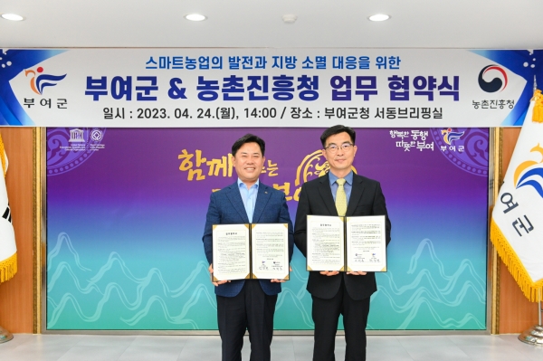 [세종타임즈] 부여군이 지난 24일 지자체 최초로 농촌진흥청과 부여군 스마트농업의 발전 및 미래 첨단농업 육성을 위한 업무협약을 체결했다.