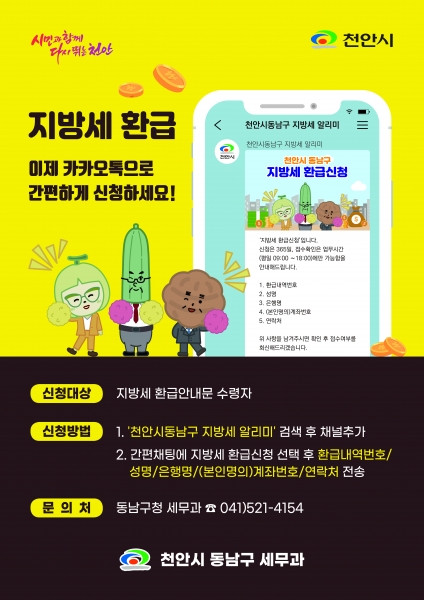 [세종타임즈] 천안시 동남구는 언제 어디서나 간편하게 지방세 환급금을 신청할 수 있도록 카카오톡을 통한 환급신청 서비스를 운영한다고 26일 밝혔다.