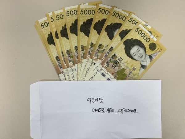 직산읍에 따르면 이름을 밝히지 않은 기부자는 ‘어린이날을 기념해 직산읍의 어려운 어린이들을 위해 써달라’며 50만원 기부금이 담긴 봉투를 전달하고 황급히 사라졌다.