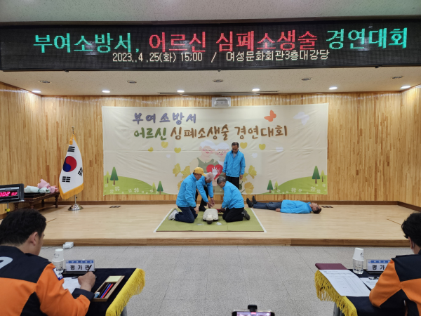 대회는 만 65세 이상 어르신들이 5인 이내의 팀을 구성해 대한노인회 부여군지회 부설 부여노인대학팀을 비롯한 5개 팀이 참가했으며 각 참가팀이 심정지 상황을 가정한 5분 이내의 짧은 연극을 진행하는 형태로 진행됐다.