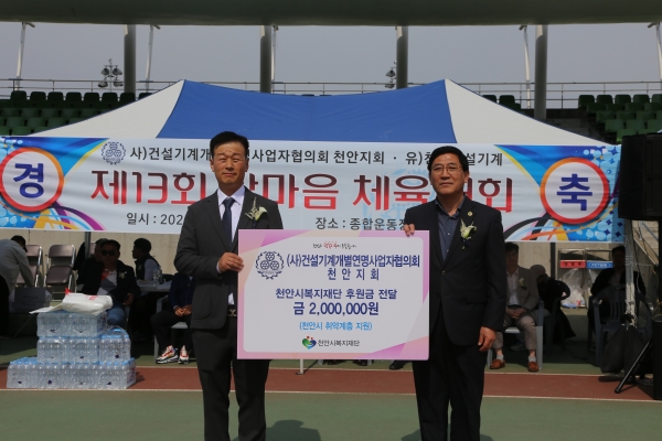 [세종타임즈] 건설기계개별연명사업자협의회 천안지회가 지난 1일 천안지역 취약계층을 위해 사용해 달라며 후원금 200만원을 천안시복지재단에 전달했다.