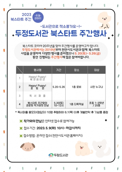 이번 행사는 북스타트 관련 Happy Puppy 포토존 HappyPuppy 북큐레이션 독서퍼즐 북스타트 주간맞이 작가와의 만남으로 구성됐다.