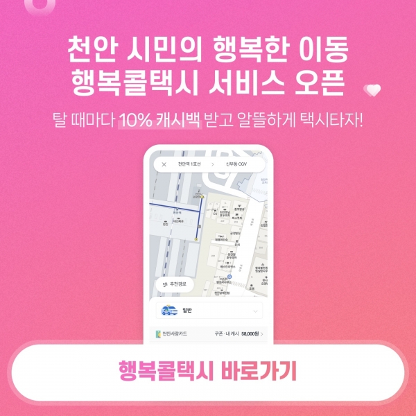 별도의 앱 설치나 회원가입 필요 없이 택시를 부를 수 있고 천안사랑카드와 연동한 요금 자동결제가 가능해 시민들의 택시 이용 편의성을 한층 높였다.