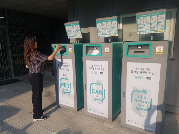 투명페트병, 캔, 종이팩 분리수거함은 재활용품을 투입하면 1개당 10포인트의 적립금이 쌓인다.