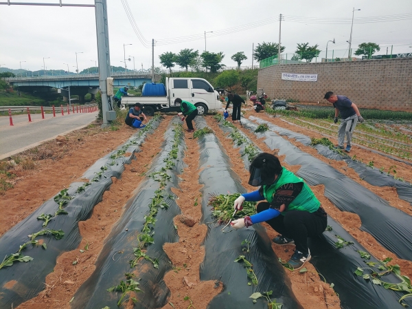 이날 새마을남녀협의회 회원 10여명은 이른 아침부터 신방동 내 유휴농지를 활용한 텃밭에서 밭을 일구고 고구마를 심었다.