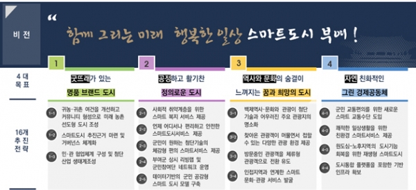 굿뜨래가 있는 명품 브랜드 도시 공정하고 활기찬 정의로운 도시 역사와 문화의 숨결이 느껴지는 꿈과 희망의 도시 자연친화적인 그린공동체 등 4대 추진목표와 6개 중점분야, 18개 세부사업으로 스마트서비스 구축을 위한 중장기 로드맵이 담겨 있다.