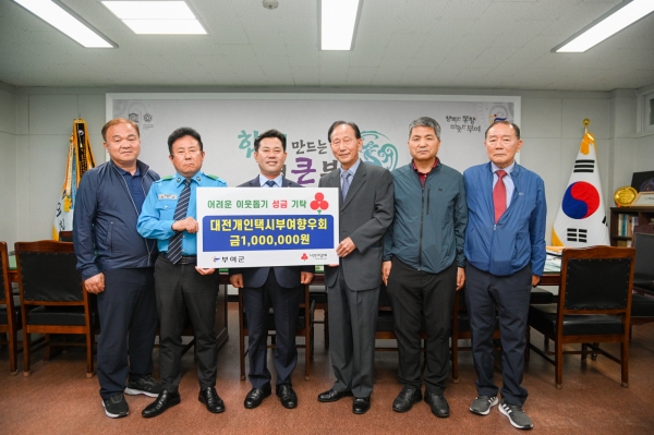 대전개인택시부여향우회는 대전에서 개인택시업에 종사하는 부여 출신 택시기사 50여명으로 구성된 모임으로 고향인 부여군에 2019년부터 매년 이웃돕기성금과 굿뜨래 장학금을 기탁해 오고 있다.