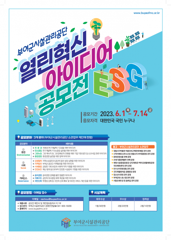이번 공모전은 대한민국 국민 누구나 참여 가능하며 부여군시설관리공단 소관 업무에 한해 ESG 3개 분야로 진행된다.