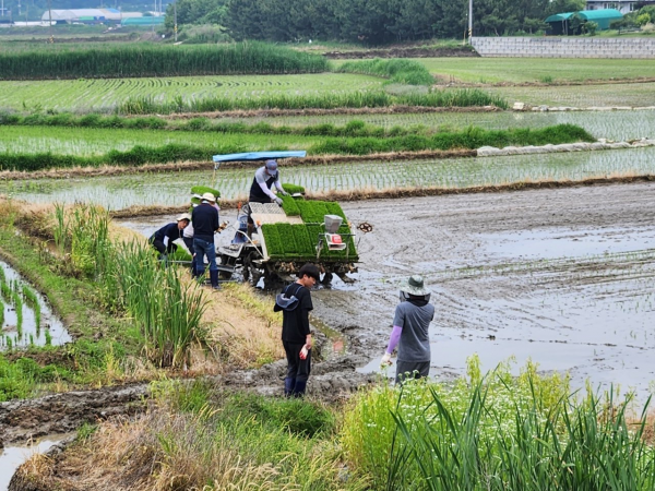 바쁜 영농철임에도 불구하고 부여읍이장단 및 직원 등 30명은 쌍북리 소재 논 두 필지를 활용해 지역 내 어려운 이웃에게 나눠 줄 쌀을 생산하기 위한 모내기 작업에 참여했다.