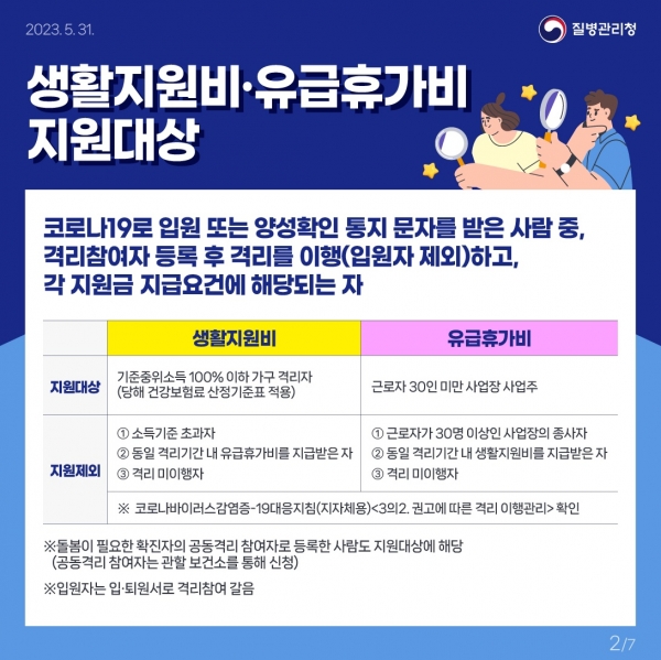 질별관리청의 결정에 따라 코로나19 확진자는 5일 권고로 전환돼 코로나 확진 시의 의무적 격리기간이 사라지며 입원하거나 자발적으로 격리에 참여하고 격리참여자로 등록한 ‘기준 중위소득 100% 이하 가구’는 코로나19 생활지원비를 지원받을 수 있게 됐다.