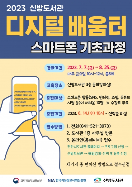 [세종타임즈] 천안시 신방도서관은 오는 7월 7일부터 스마트기기 활용이 어려운 디지털 약자의 편의 제공을 위한 디지털배움터를 운영한다고 12일 밝혔다.