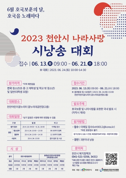 호국보훈과 나라 사랑을 표현한 국내 발표된 시를 낭송하는 ‘나라사랑 시낭송 대회’는 천안시가 애국 충절의 고장으로서 호국보훈 정신을 기리고 나라 사랑 마음을 높이기 위해 올해 처음으로 개최한다.