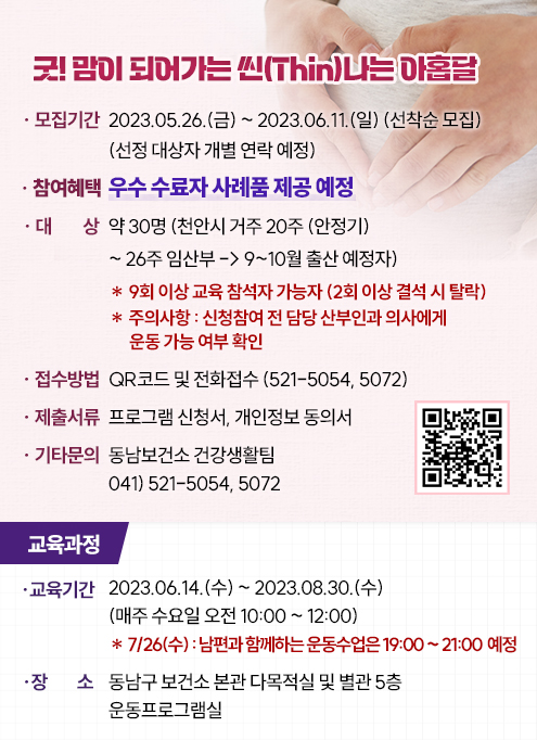 [세종타임즈] 천안시 동남구보건소는 8월까지 임산부의 비만 예방 및 관리를 위해 ‘굿맘이 되어가는 씬나는 아홉달’ 프로그램을 운영한다고 14일 밝혔다.
