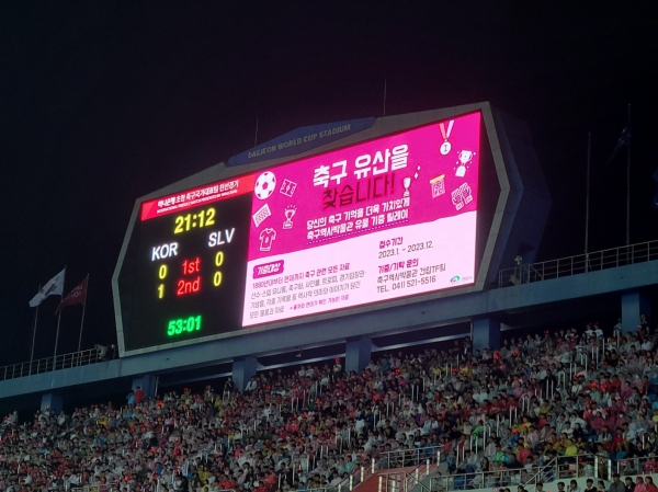 또 지난 16일과 20일 각각 부산아시아드주경기장과 대전월드컵경기장에서 진행된 축구 국가대표 친선경기에서도 경기장 내 A보드와 전광판을 통해 축구역사박물관 유물 기증 홍보를 진행했다.