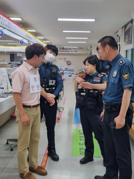 이번 훈련은 특이 민원인에 의해 발생 될 수 있는 돌발행동을 가상한 훈련 상황을 설정하고 매뉴얼에 따라 상황 발생, 상급자 적극 개입 민원인 진정, 피해 공무원 보호 및 방문 민원인 대피, 비상벨 호출 및 경찰 출동 등 단계별 행동요령 숙지와 대응력 제고에 중점을 두고 실시됐다.