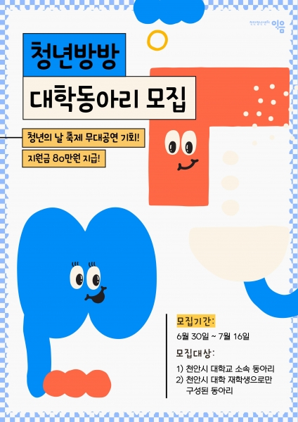 천안시 대학 재학생으로만 4명 이상 구성된 음악, 연주, 댄스, 영상, 연극, 뮤지컬, 퍼포먼스, 전통 등 무대 공연이 가능한 문화예술 분야 동아리를 모집해 7월부터 10월까지 약 4개월 동안 다채로운 문화예술 활동을 펼칠 수 있도록 지원한다.