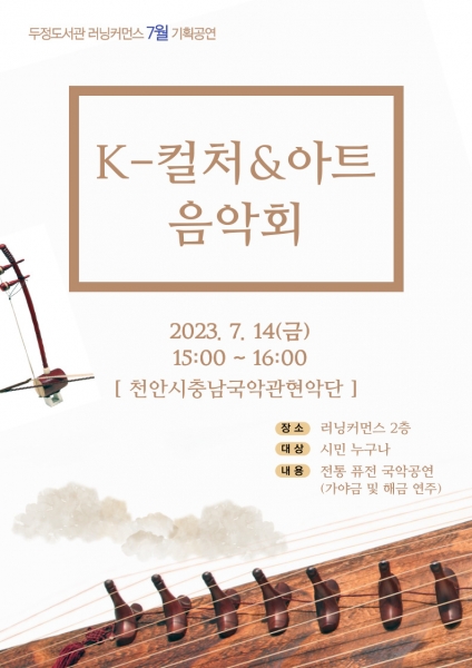 [세종타임즈] 천안시 두정도서관가 오는 14일 ‘K-컬처&아트 음악회’ 7월 공연으로 천안시 예술단인 충남국악관현악단의 전통 퓨전 국악공연을 실시한다.