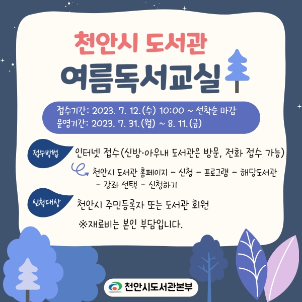 접수는 12일부터 천안시 도서관 홈페이지에서 선착순으로 신청할 수 있으며 신방·아우내도서관은 전화 및 방문 접수도 가능하다.