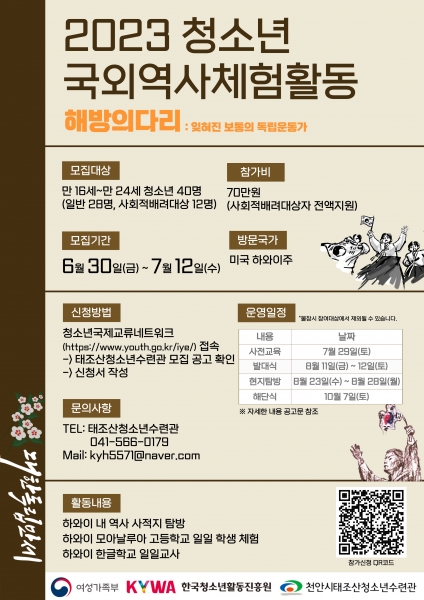 국제적 시각과 자질을 갖춘 청소년 리더 양성을 목표로 운영될 청소년국외역사체험활동사업은 ‘해방의 다리 : 잊혀진 보통의 독립운동가’를 주제로 청소년들과 하와이 내 역사 사적지 탐방, 모아날루아 고등학교 일일학생 체험, 한글학교 일일교사 등의 활동을 펼친다.