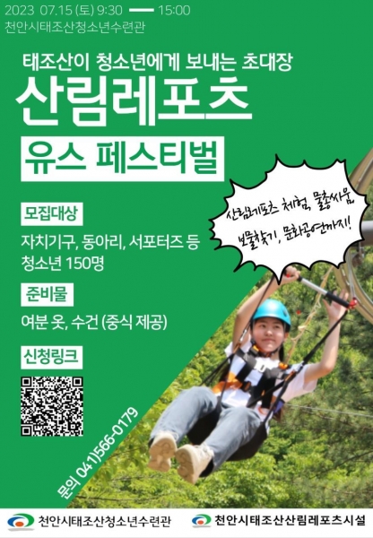 천안시태조산청소년수련관과 천안시태조산산림레포츠단지의 협력으로 개최하는 이번 페스티벌은 자치기구, 동아리, 서포터즈 등 청소년 150여명을 대상으로 산림레포츠시설 체험, 문화공연, 워터워즈 등 다양한 프로그램을 진행한다.