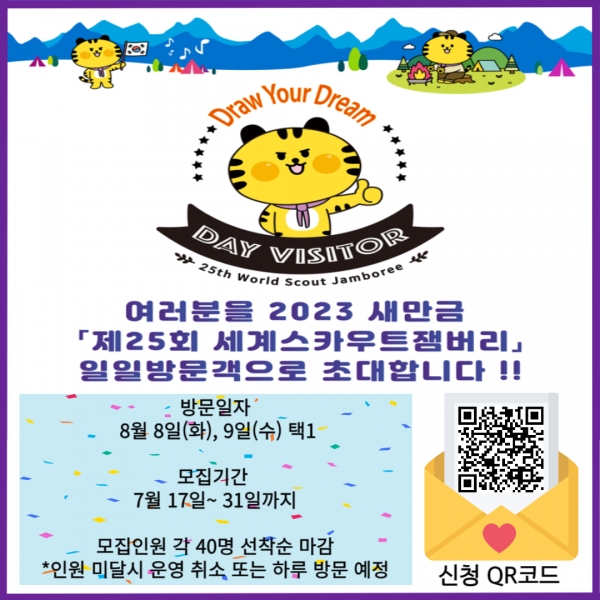 전북 부안군에서 펼쳐지는 국제 스카우트 문화축제 행사인 세계스카우트잼버리는 ‘너의 꿈을 펼쳐라’(Draw your Dream) 라는 주제로 8월 1일~12일 12일간 진행된다.
