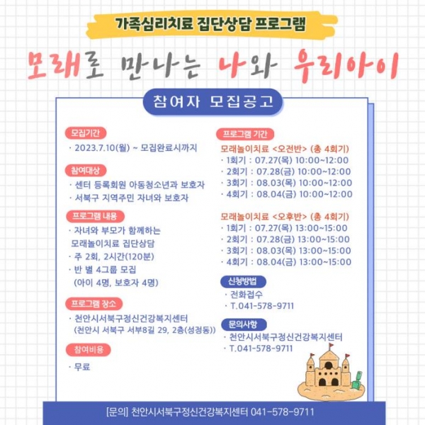 집단모래놀이치료는 오는 27일부터 8월 4일까지 서북구정신건강복지센터에서 오전반, 오후반으로 주 2회 진행될 예정이다.