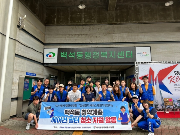 이번 재능봉사는 복지사각지대 없는 백석사랑지대 만들기 사업의 일환으로 추진됐으며 삼성전자서비스 천안두정센터 직원들은 정기적으로 에어컨 필터 청소를 하지 못한 저소득 취약계층 27가구를 대상으로 에어컨 필터를 청소했다.