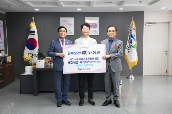 [세종타임즈] ㈜바이콘이 지난 17일 천안지역 미혼모를 위해 출산용품 패키지를 천안시복지재단에 전달했다.