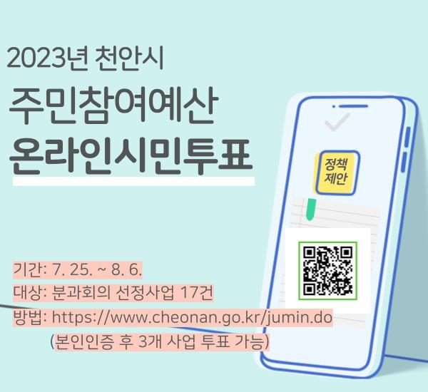 [세종타임즈] 천안시는 주민참여예산 사업 선정을 위해 온라인 시민투표를 8월 6일까지 13일간 실시한다.