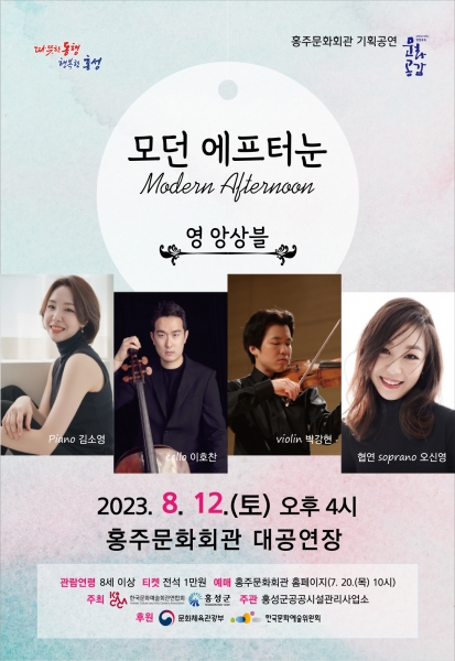 [세종타임즈] 홍성군 홍주문화회관이 ‘2023년 방방곡곡문화공감’ 공모사업에 선정되어 클래식 음악회 ‘모던 에프터눈’공연을 오는 8월 12일 오후 4시에 개최한다.