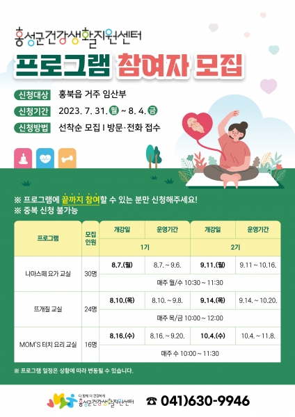 [세종타임즈] 홍성군 건강생활지원센터가 오는 31일부터 8월 4일까지 임산부의 건강관리와 육아 정보 공유를 위한 하반기 프로그램 수강생을 모집한다.