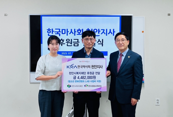 정일현 성정청소년문화의집센터장은 “미래세대인 청소년의 건강한 성장에 큰 관심을 갖고 후원해주신 한국마사회 천안지사에 감사드리며 취약계층 청소년 복지를 위해 함께 노력하겠다”고 전했다.