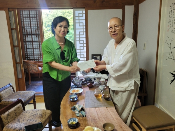 부현 스님은 이번 수해로 인해 어려움을 겪고 있는 지역민들에게 조금이나마 힘이 되어주길 바란다며 500만원을 안경림 면장에게 전달했다.