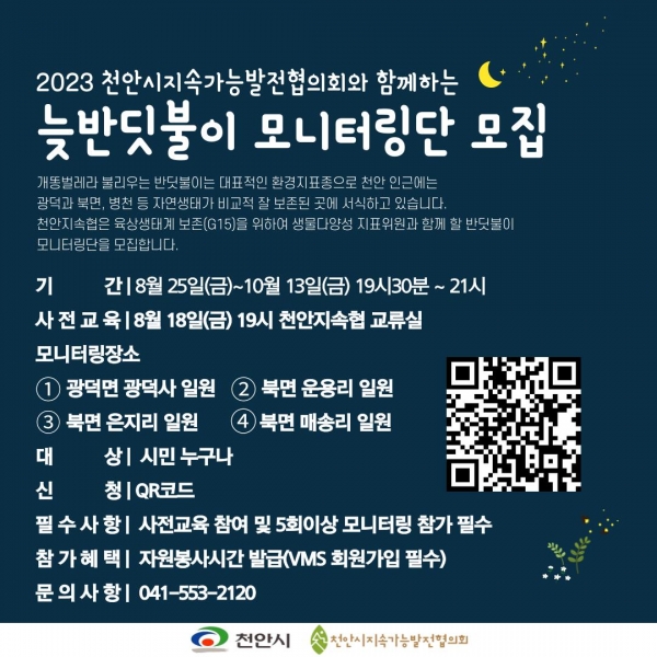 [세종타임즈] 천안시지속가능발전협의회는 생물종다양성 지표모임 위원과 시민과학자로 구성된 ‘늦반딧불이 모니터링단’을 모집한다.