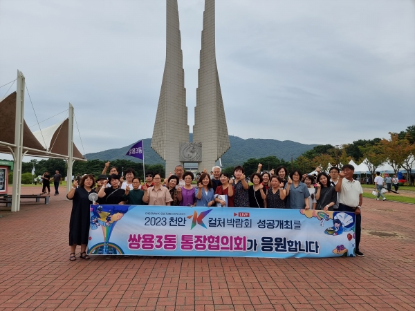 이날 쌍용3동 통장협의회 회원들은 11일부터 15일까지 열리는 ‘2023 천안 K-컬처 박람회’의 성공 개최를 위해 행사장인 독립기념관에 모여 응원 캠페인을 열고 박람회장을 두루 살폈다.