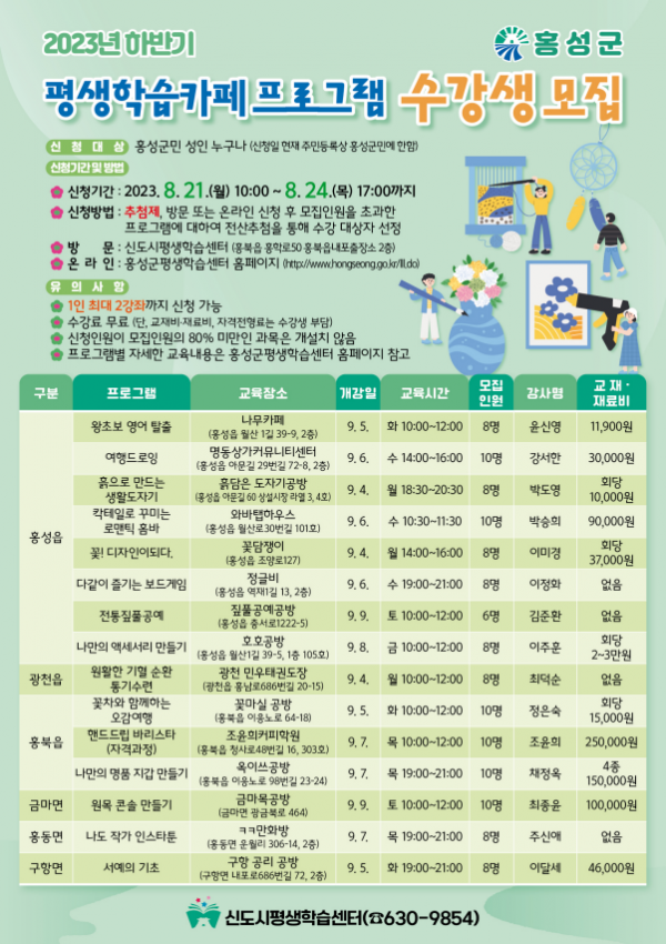 수강 신청 접수는 8월 21일 10시부터 24일 오후 5시까지 진행되며 신도시평생학습센터 방문 접수 또는 홍성군평생학습센터 홈페이지에서 온라인 접수 가능하다.