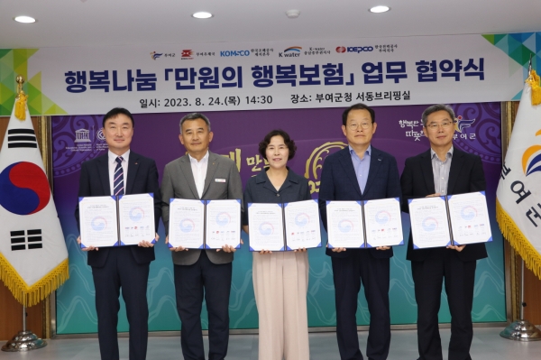 이날 협약식에는 소명수 부군수와 부여우체국 성미수 국장을 비롯해 한국조폐공사 조재광 본부장, K-water 충남중부권 윤이수 지사장, 부여 한국전력공사 강명구 지사장이 참석했다.