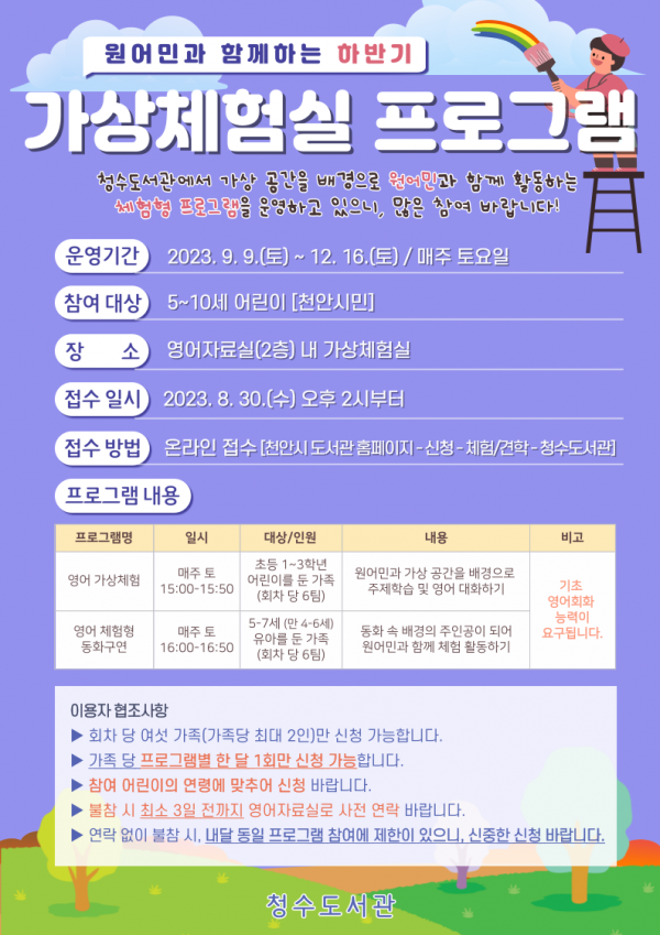 [세종타임즈] 천안시 청수도서관이 오는 9월부터 12월까지 ‘원어민과 함께하는 하반기 가상체험실 프로그램’을 운영한다고 29일 밝혔다.