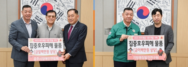 충남지방행정발전연구원은 지방자치단체의 각종 연구용역을 수행하는 기업으로 공주시 지역사회보장계획 수립 등 연구용역을 수행하면서 인연을 맺은 공주시가 수해로 어려움을 겪고 있다는 소식을 접하고 작지만 힘을 보태고 싶다며 도움의 손길을 보내왔다.