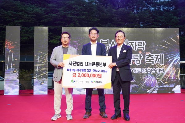 또 천안미곡처리장은 쌀 50포를, 사단법인 나눔운동본부는 취약계층 아동과 한부모 가정을 위해 200만원을 쌍용3동에 전달했다.