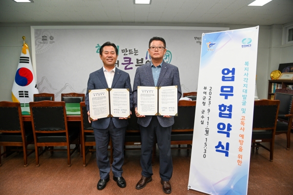 [세종타임즈] 부여군이 지난 11일 군수실에서 한전MCS부여지점과 ‘복지사각지대 발굴 및 고독사 예방을 위한 업무협약’을 체결했다고 밝혔다.